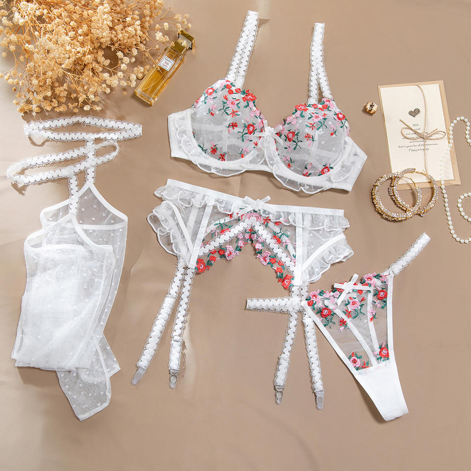 Ensemble de lingerie sexy en dentelle florale brodée avec volants, soutien-gorge et culotte, ensemble de lingerie en maille transparente avec bas