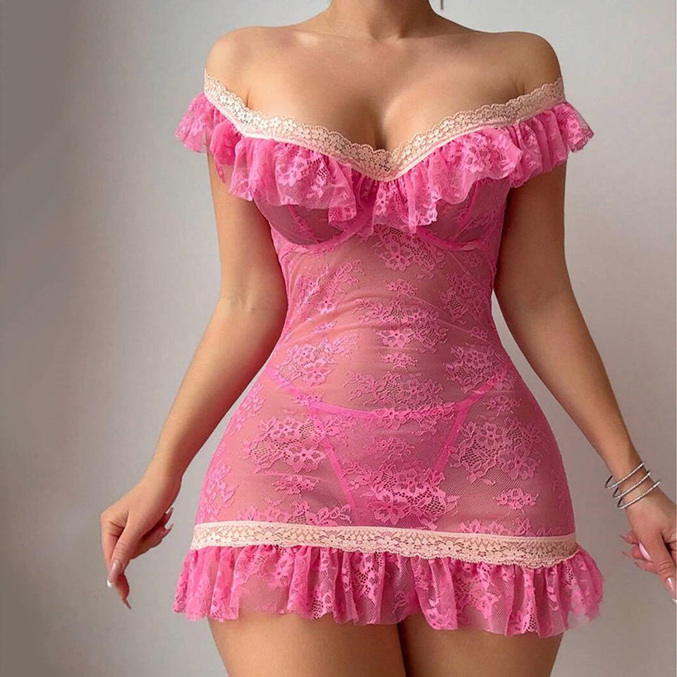 Mini-robe sexy en dentelle, chemise moulante en maille transparente pour soirée nuptiale, lingerie coquette avec bordure florale et design épaules dénudées