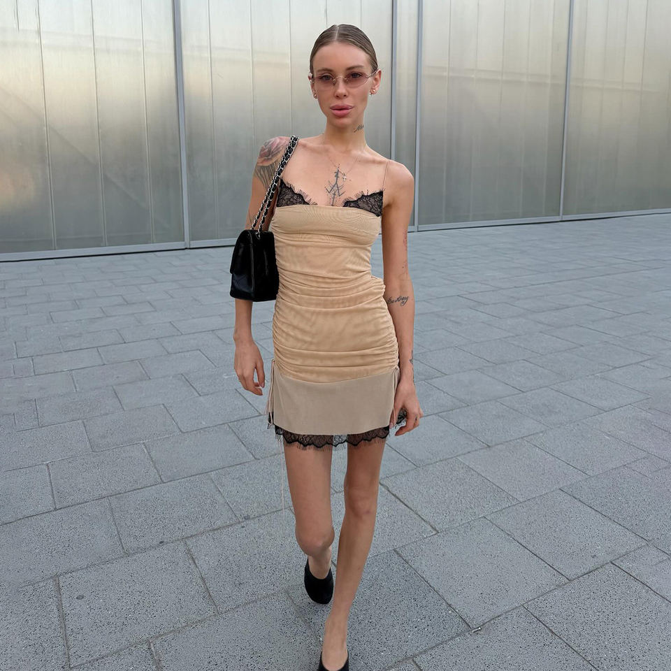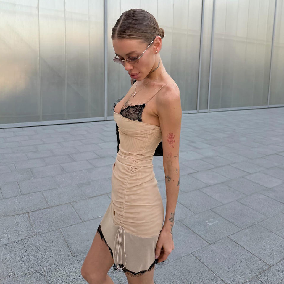 Robe mini crayon sexy sans bretelles en dentelle patchwork unie, taille naturelle, écologique, avec cordon de serrage latéral et fronces