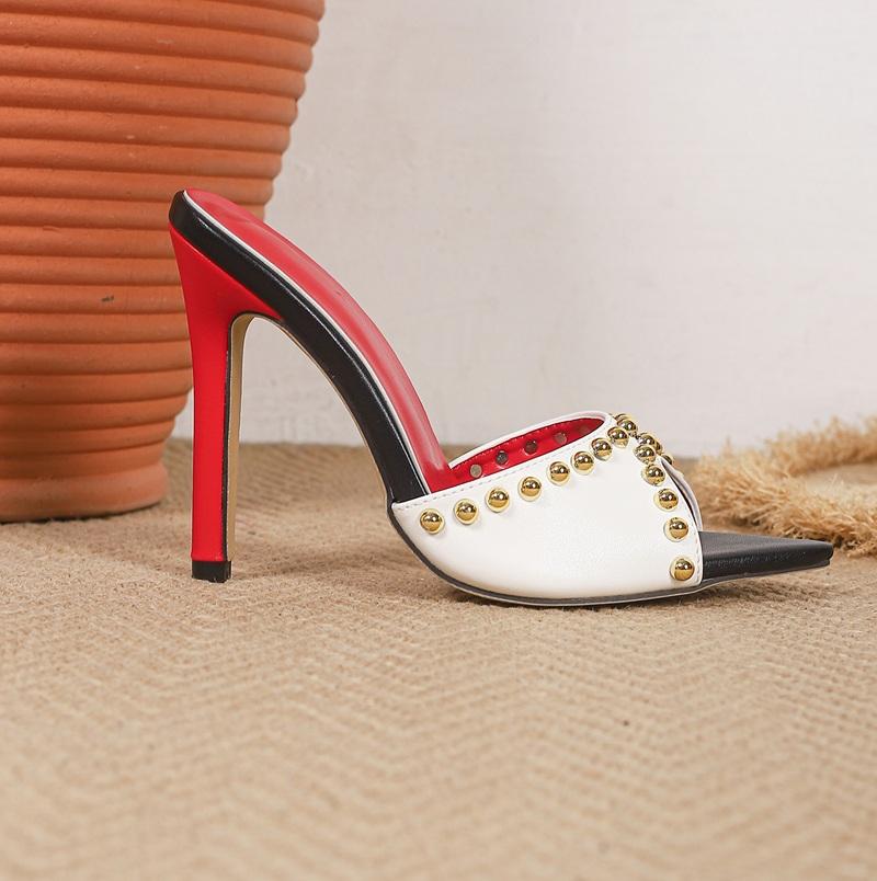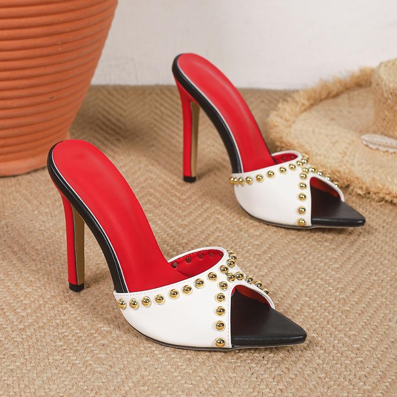 Mules à talons hauts sexy à bout pointu pour femmes, sandales de soirée élégantes à talons aiguilles avec semelle intérieure rouge et clous dorés de luxe