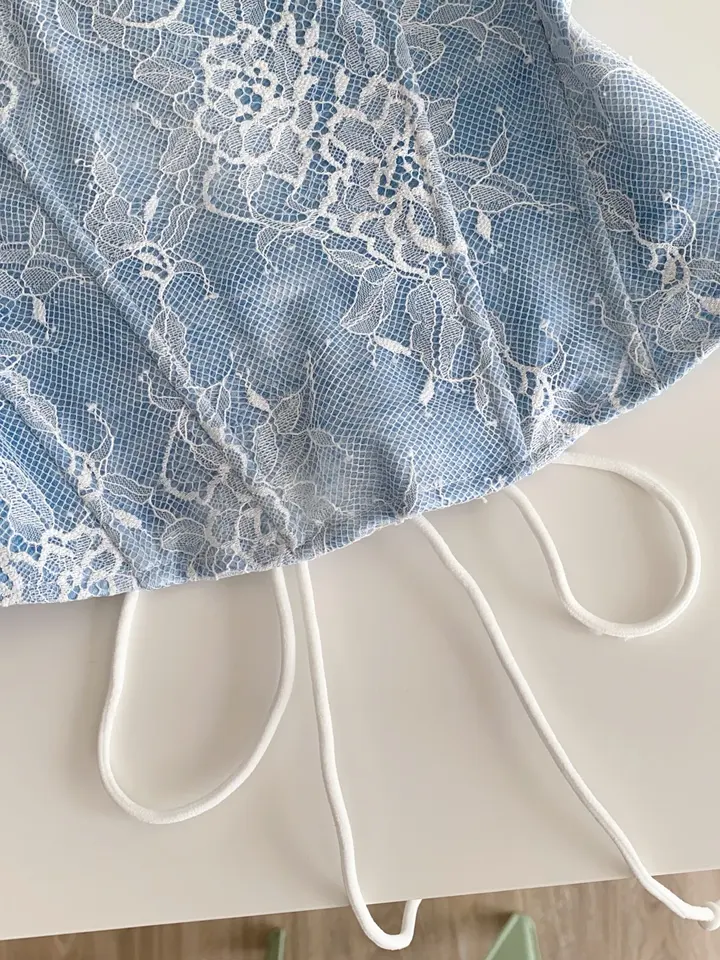 Top court bustier sexy sans manches en dentelle tissée 100 % polyester avec cordon de serrage, style Y2K chic pour femme