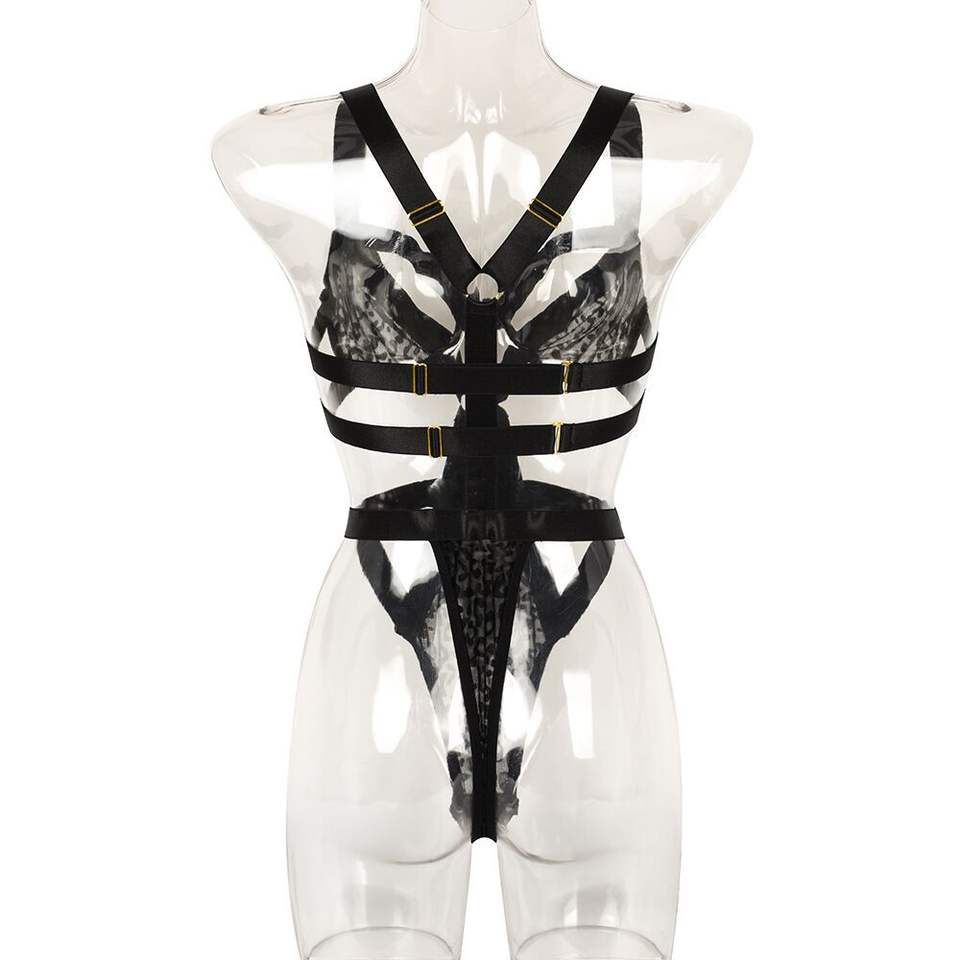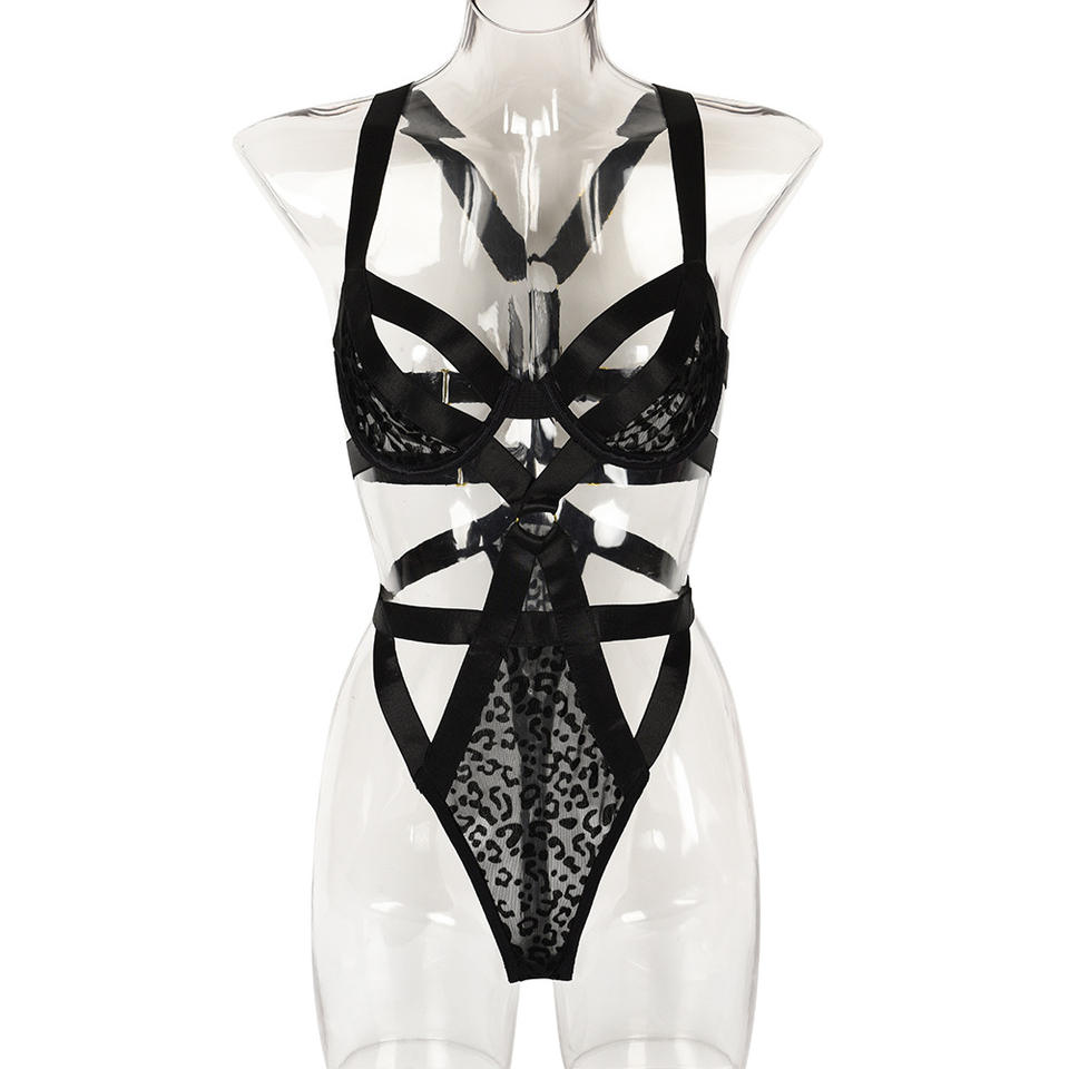 Body sexy transparent à imprimé léopard en maille avec bandes croisées, ensemble soutien-gorge et culotte érotique ajouré