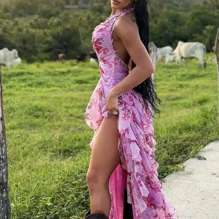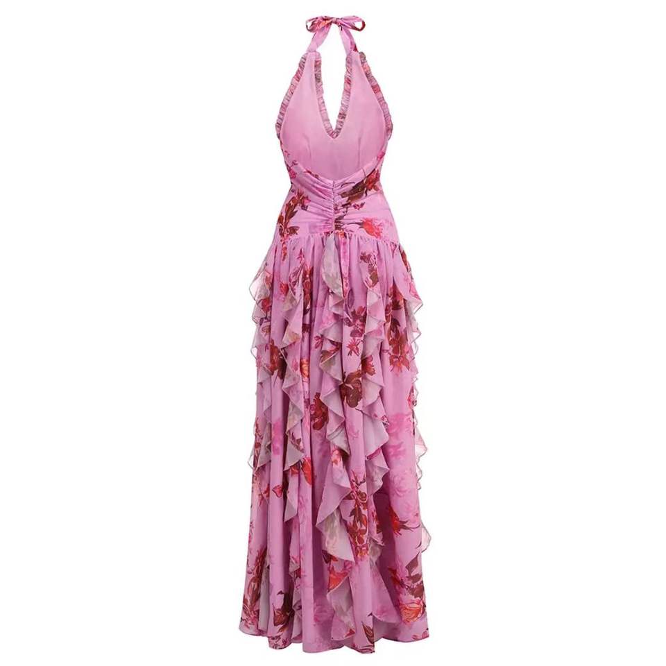 Robe longue élégante et décontractée à imprimé floral, col en V sexy, volants, dos nu, fente latérale, lavable, idéale pour les soirées, la plage et les vacances