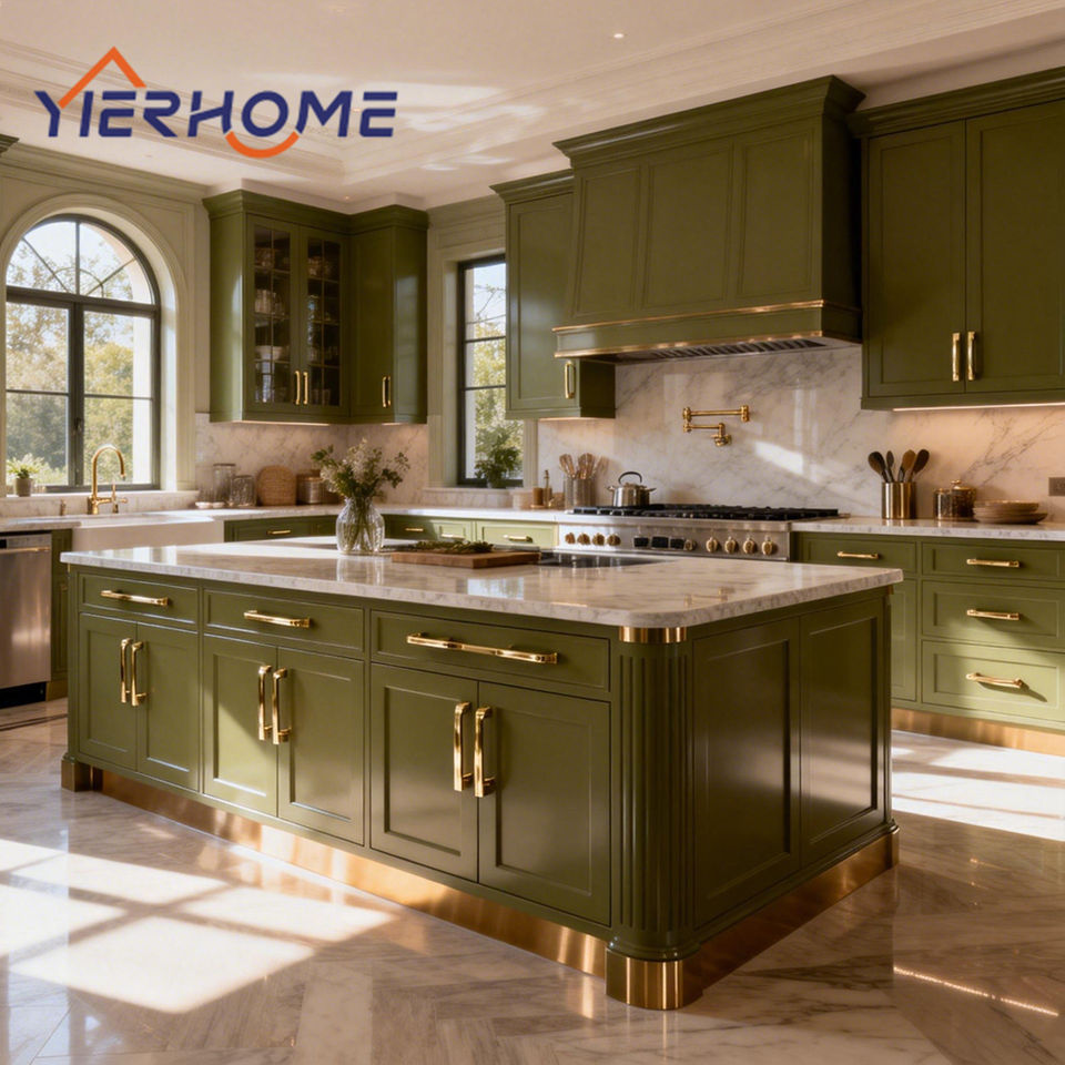Ensemble de rénovation de cuisine modulaire standard avec îlot cuisine en bois massif peint en vert de style shaker appareils