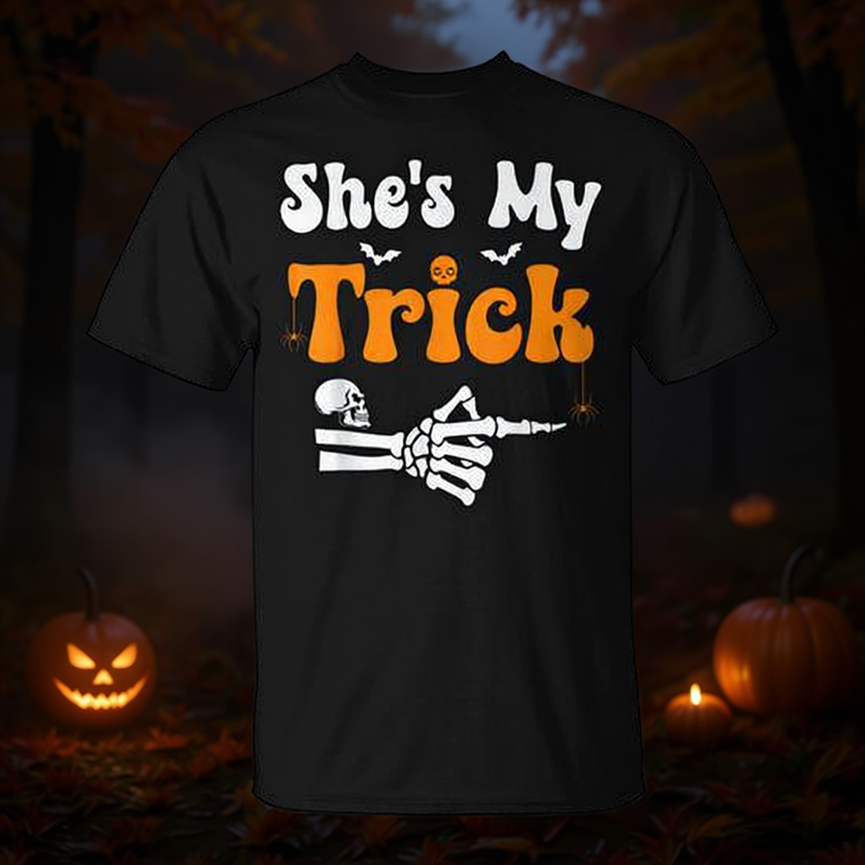 T-shirt assorti pour couples She's My Trick Skeleton pour Halloween