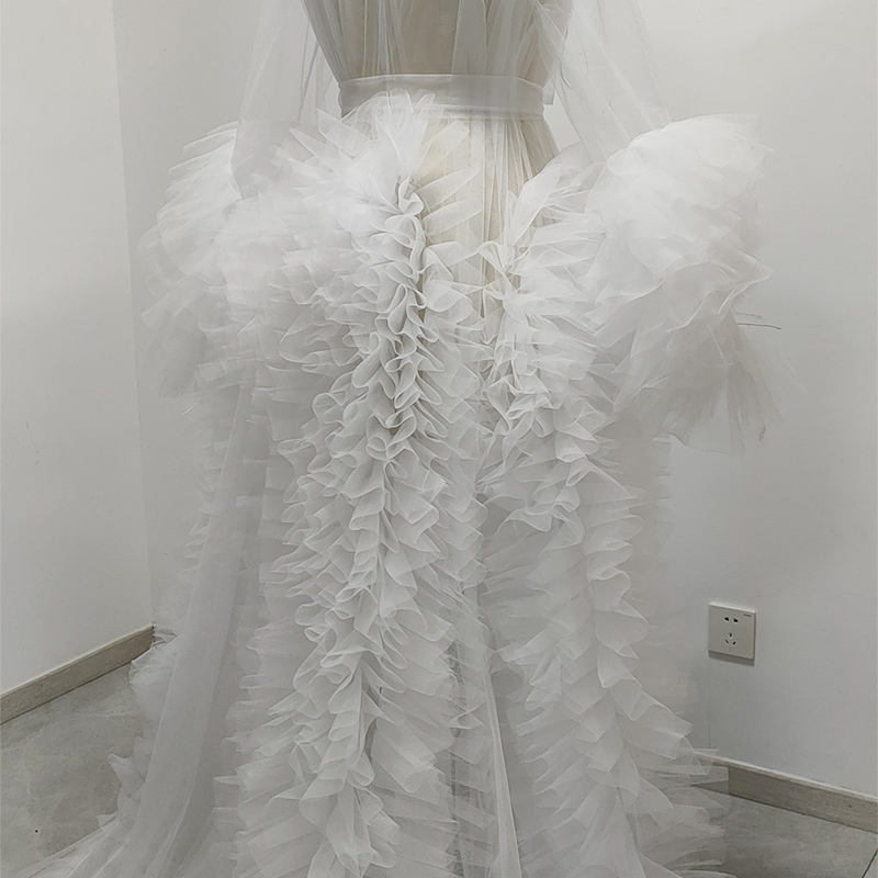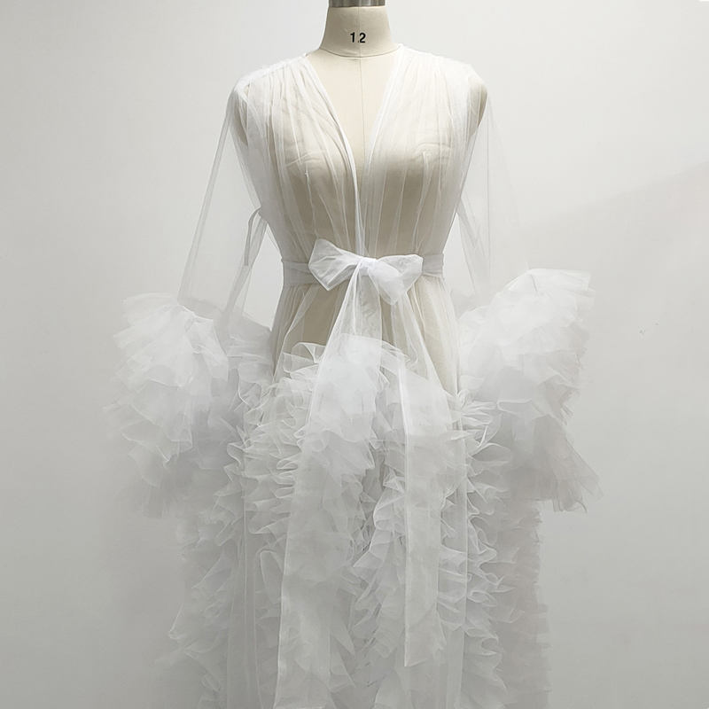 Robe longue en tulle transparente à manches bouffantes et volants, idéale pour les mariages, les séances photo et la maternité