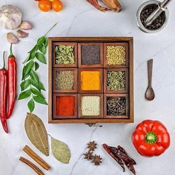 Plateau de table en bois de Sheesham avec récipients Masala Dabba Boîte à épices de cuisine Cuillère-Boîtes de rangement marron Décoration intérieure Matière plastique