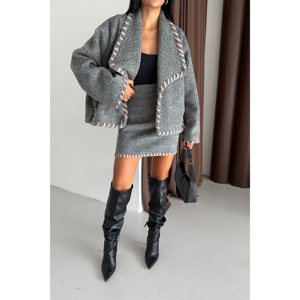 Shepherd's Stitch Women's Grey Wool Crop Jacket with Short Skirt Set