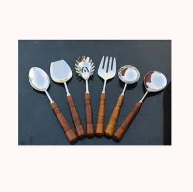 Ensemble de service à soupe et à salade avec cuillère polie miroir argent brillant brillant avec serveurs décoratifs en métal à manche martelé en bois