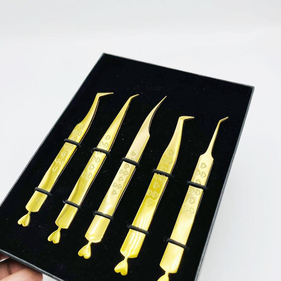 Pincettes à cils en acier inoxydable plaqué or Paire de 2 pièces 45 degrés et botte Volume russe Pinces à cils gravées en forme de cœur