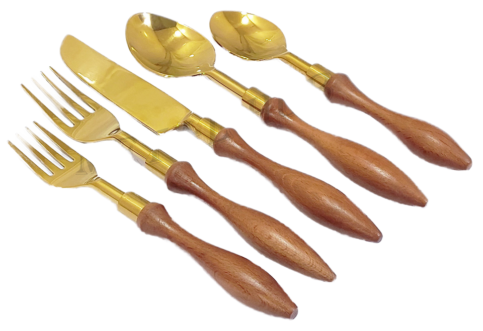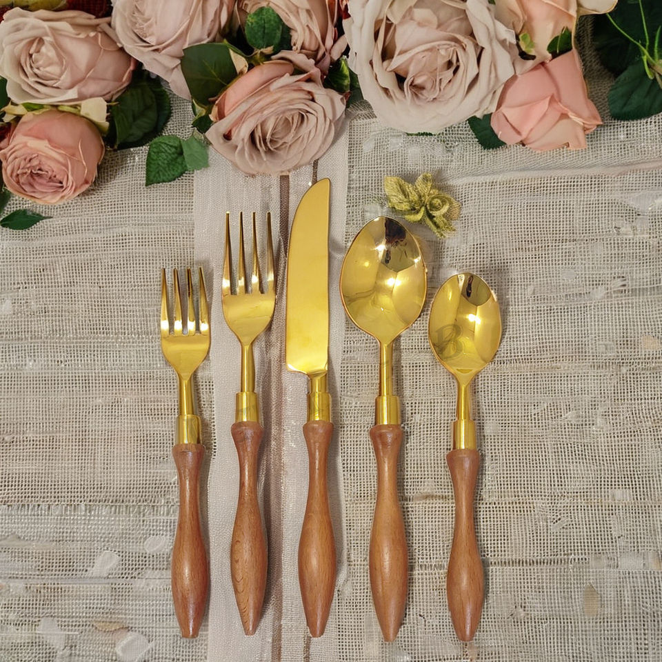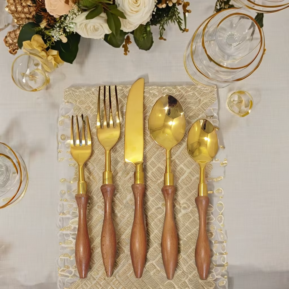 Ensemble de couverts en acier inoxydable or brillant manche en spirale en bois de luxe couverts parfaits pour les mariages cadeaux d'affaires utilisation écologique