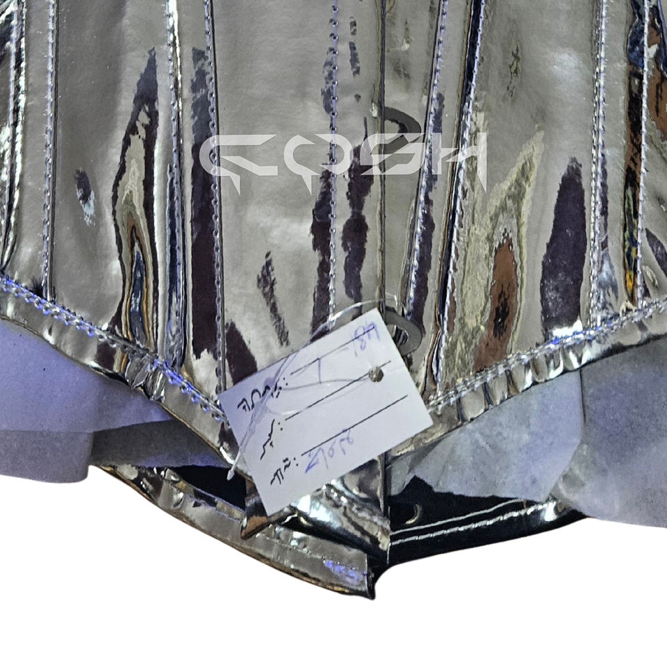 Corset de maintien de la taille en acier, argenté métallisé brillant, avec bonnets arrondis et fermeture frontale à busclettes