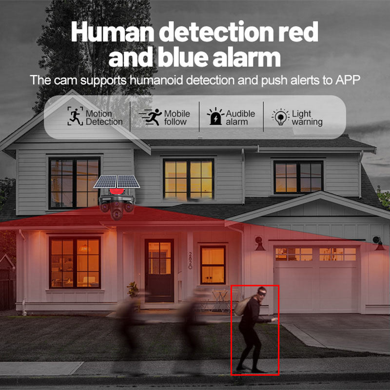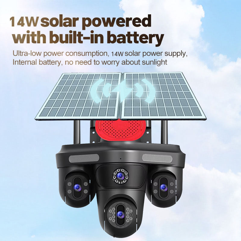 Caméra de surveillance réseau PTZ solaire ShooCam 8K extérieure à quatre objectifs, quatre écrans, carte SIM 4G, AI, AOV, CCTV