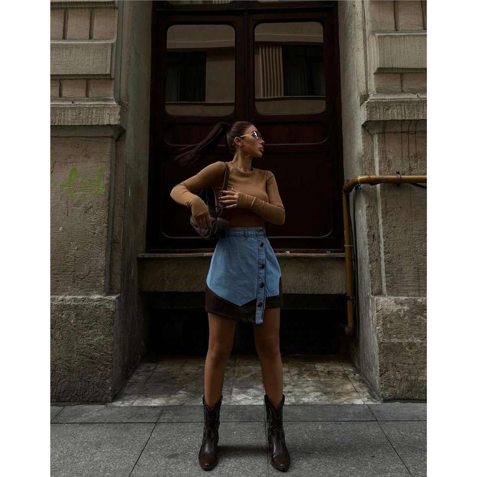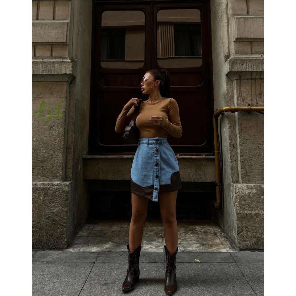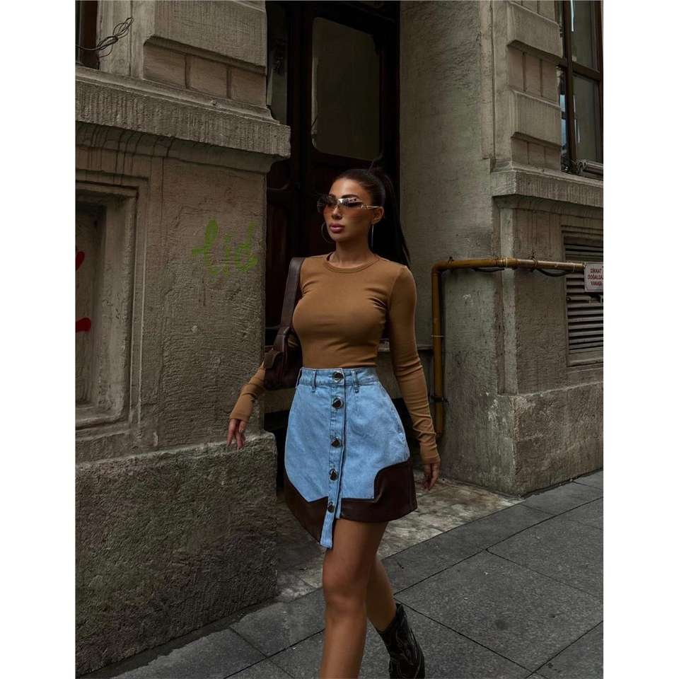 Jupe courte en jean marron vintage, design asymétrique, fermeture boutonnée, bordure en cuir, pour tenue décontractée ou formelle, idéale pour l'été et l'automne.