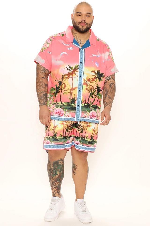 Ensemble chemise de plage 2 pièces boutonnée graphique à manches courtes pour homme Vêtements assortis Chemise et short hawaïens