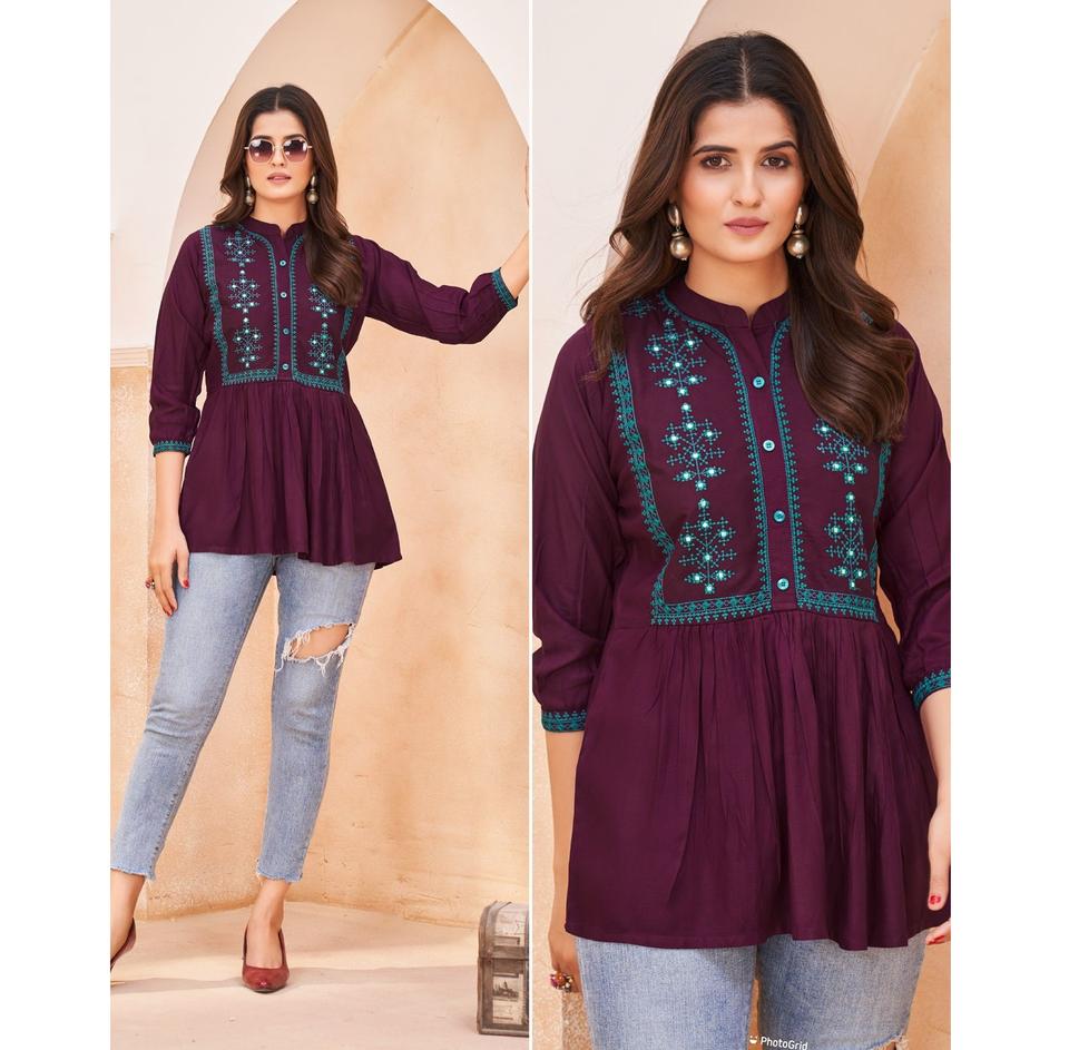Haut court Western pour dames filles rayonne mélange broderie travail imprimé dernier motif tunique hauts prêt à porter pour l'exportation