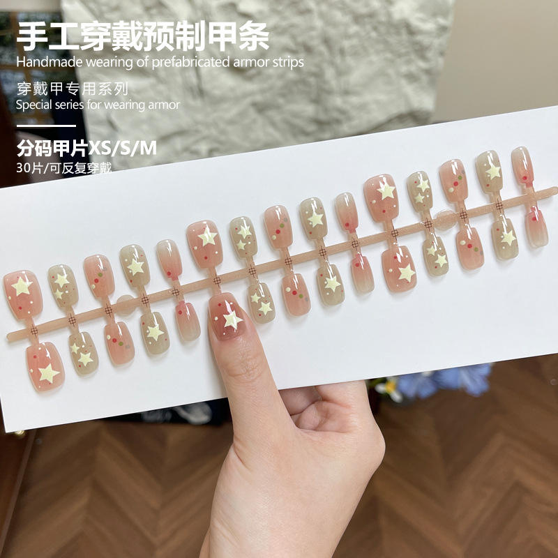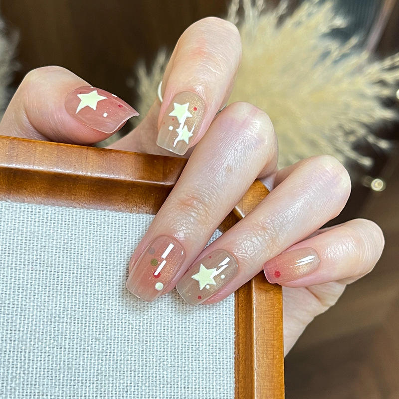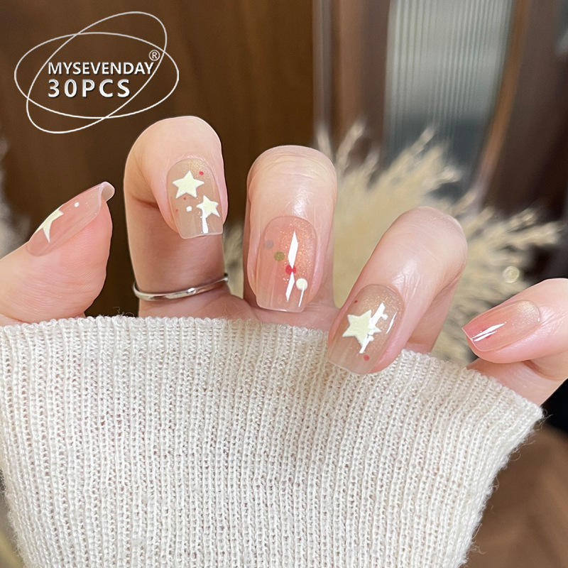 My Seven Days BY2377 Faux ongles courts à coller, faits main, 30 autocollants motif œil de chat, pois et étoiles, style dopamine, mignons et doux, ciel étoilé
