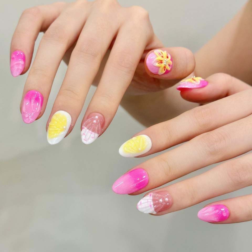 Short Almond Shell Jelly Pink Nude Beige Mango Yellow Y2K Trendy Pre-designed Finger Nail Design Island Petals Pastels