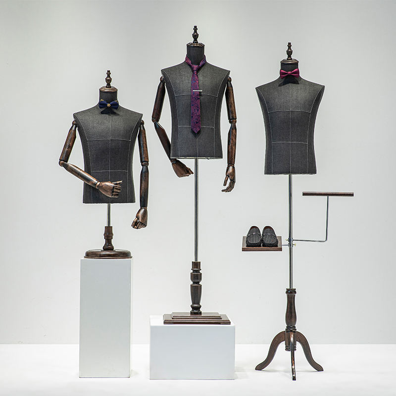 Mannequin Vitrine Homme pour Vestes, Bras Articulés en Bois, Buste Mâle en Lin Noir pour Costumes et Présentations