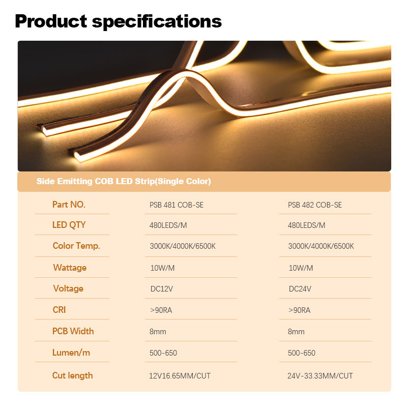 Bande LED COB à émission latérale 480LED/M DC12V/24V 10W/M CRI>90 Sans points sombres Découpable Flexible pour la décoration intérieure et commerciale