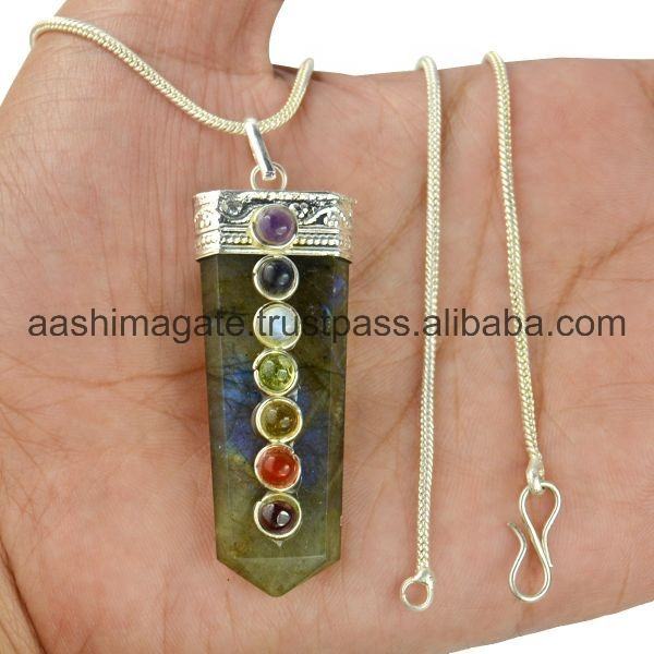 Sier Pendentif chaîne en métal poli fait à la main 7 Chakra perle Labradorite bâton plat Reiki Feng Shui bijoux de guérison Agate pierre précieuse