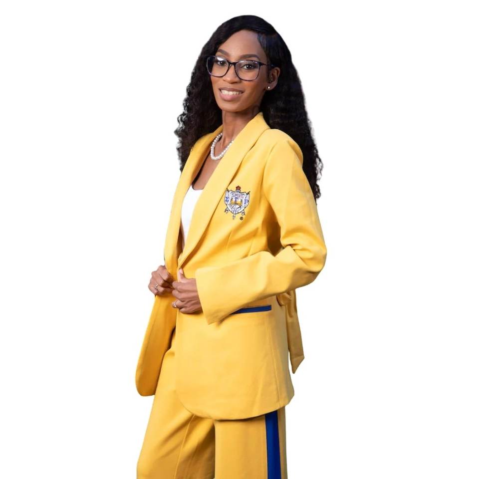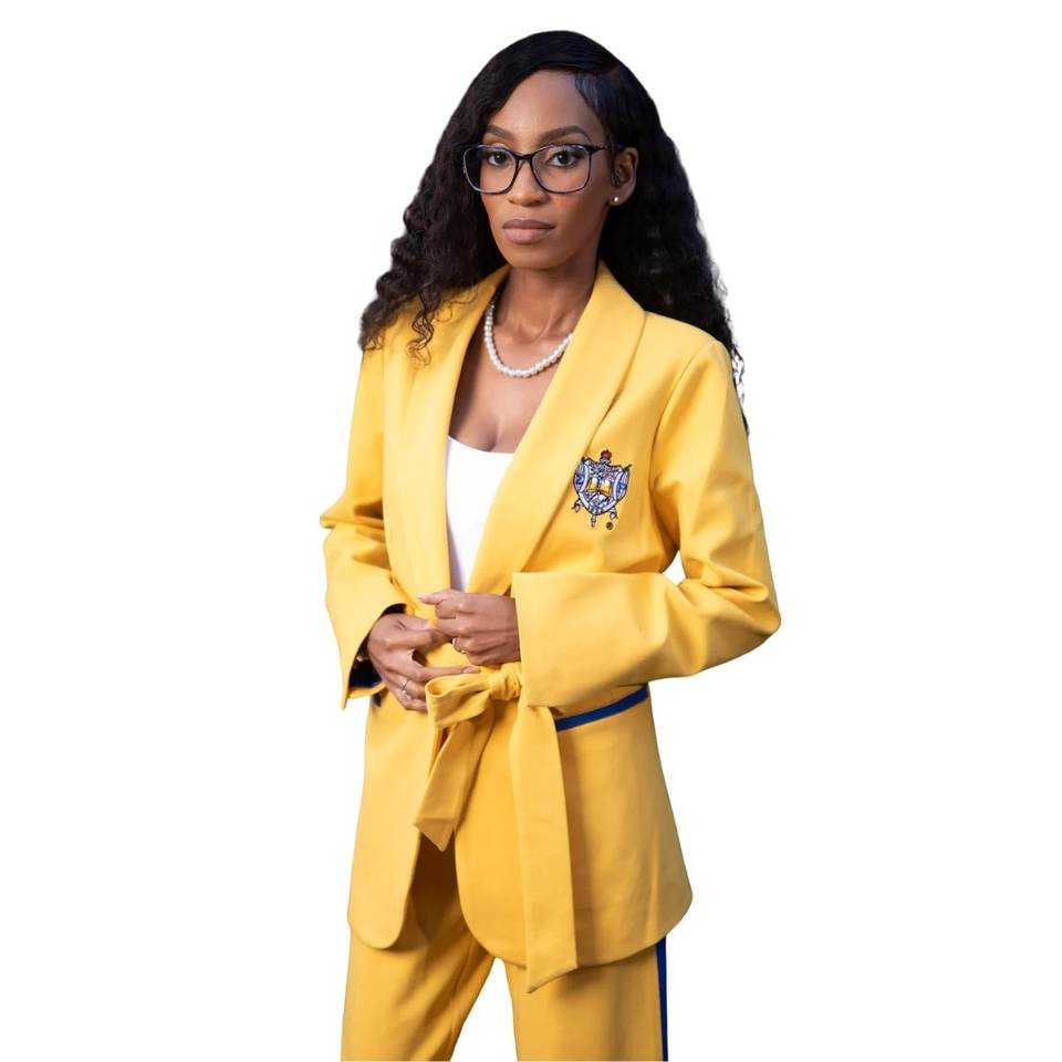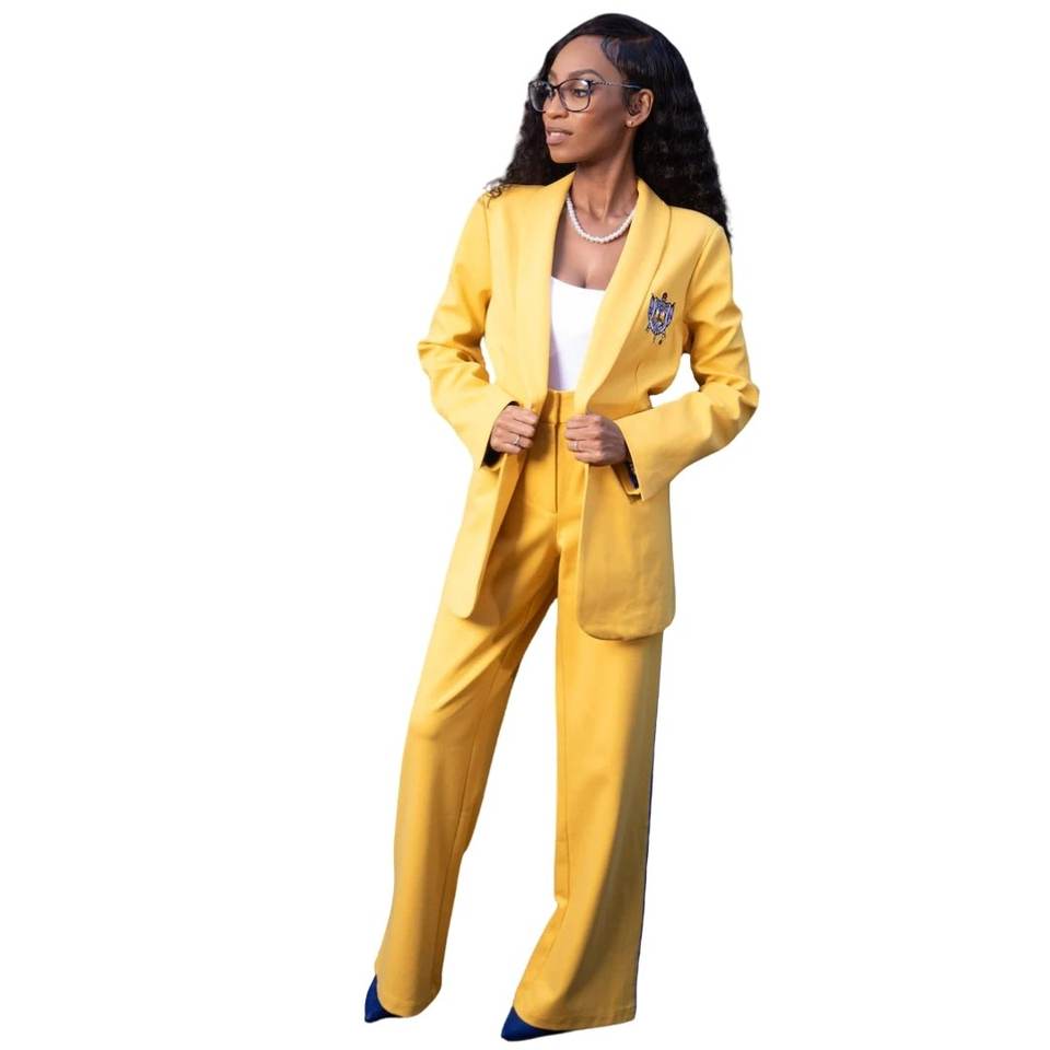 Ensemble de costume pantalon doré Sigma Gamma Rho pour femme, blazer et pantalon large, tenue formelle de sororité grecque, style élégant, mode haut de gamme