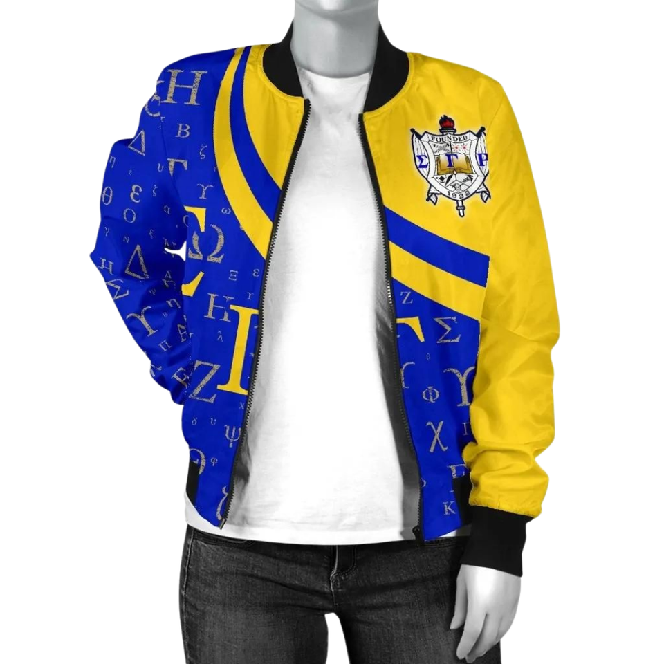 Veste en satin bleu royal et or Sigma Gamma Rho SGRho, 1922, brodée, bomber, lettres grecques, sororité, veste universitaire pour femmes