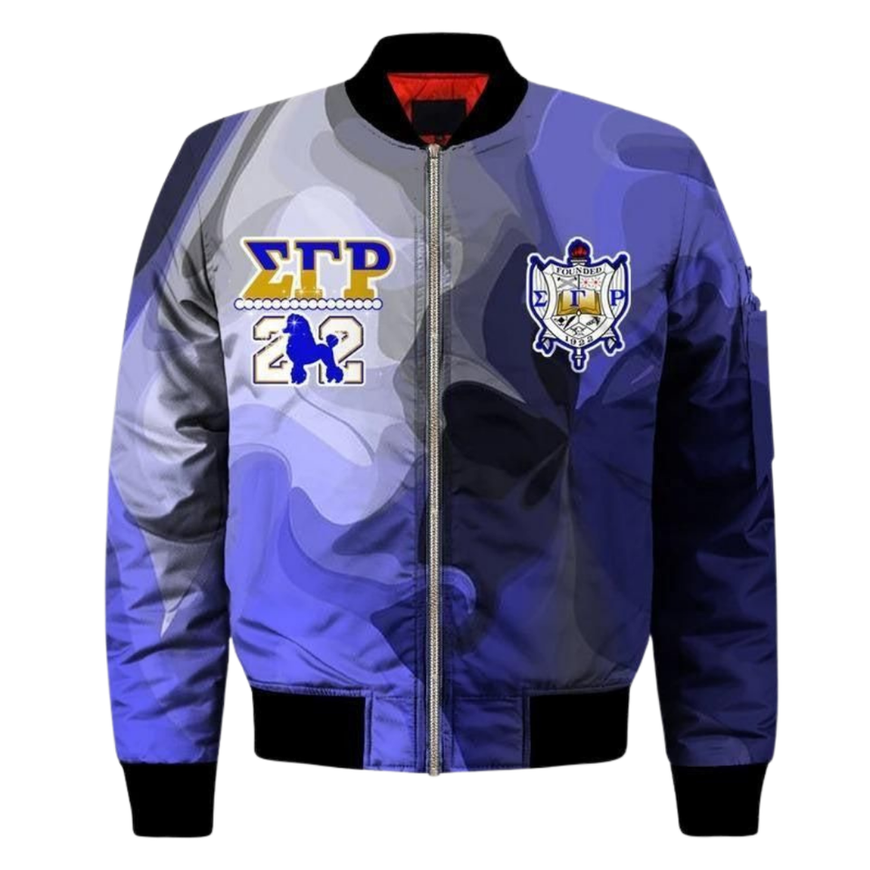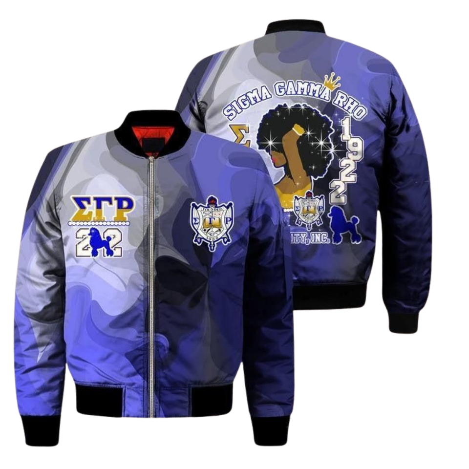 Veste bomber en satin Sigma Gamma Rho SGRho 1922 bleu or lettres grecques varsity sororité vêtements d'extérieur pour femmes