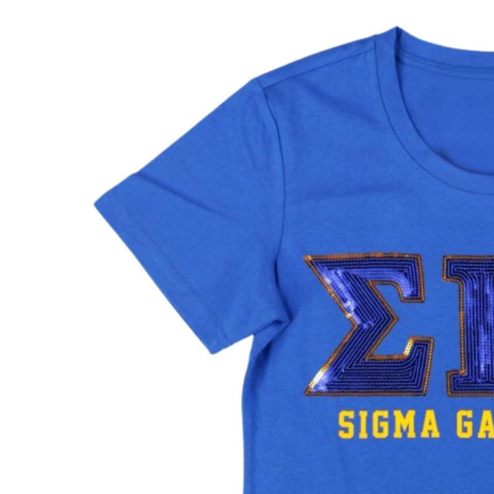 Sigma Gamma Rho SGRho Sequin Patch Tee Bleu Royal Lettres Grecques Brodées Sororité Vêtements Garniture Or Vie Grecque T-shirt