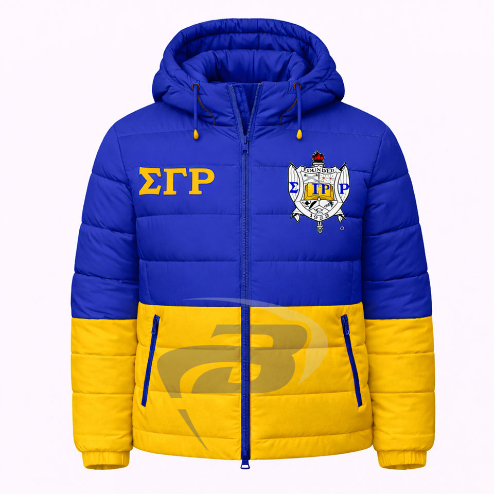 Blouson d'hiver chaud à capuche bleu et jaune de la sororité Sigma Gamma Rho, style streetwear, avec logo frontal et design grec personnalisé pour sororité