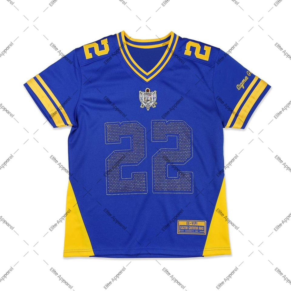Sigma Gamma Rho-Maillot de football personnalisé pour femme avec strass-Sparkling Greek Sorority Spirit Wear Chemise en maille solide pour l'été