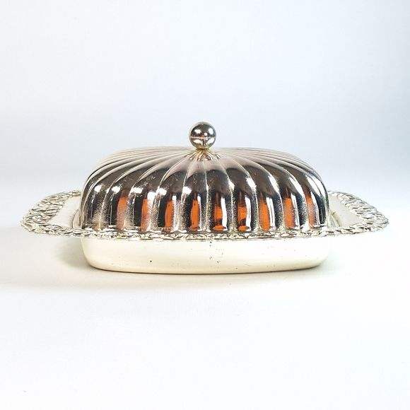 Beurrier en acier inoxydable de luxe pour une sélection de vaisselle haut de gamme, rehaussant l'ambiance de la table avec une finition métallique