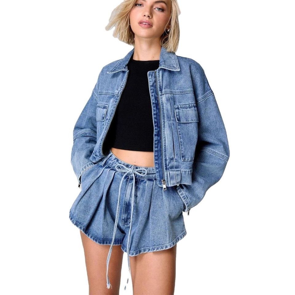 Ensemble en jean pour femme, veste plissée et pantalon court, inspiré du soleil, personnalisable, vente en gros, assortiment