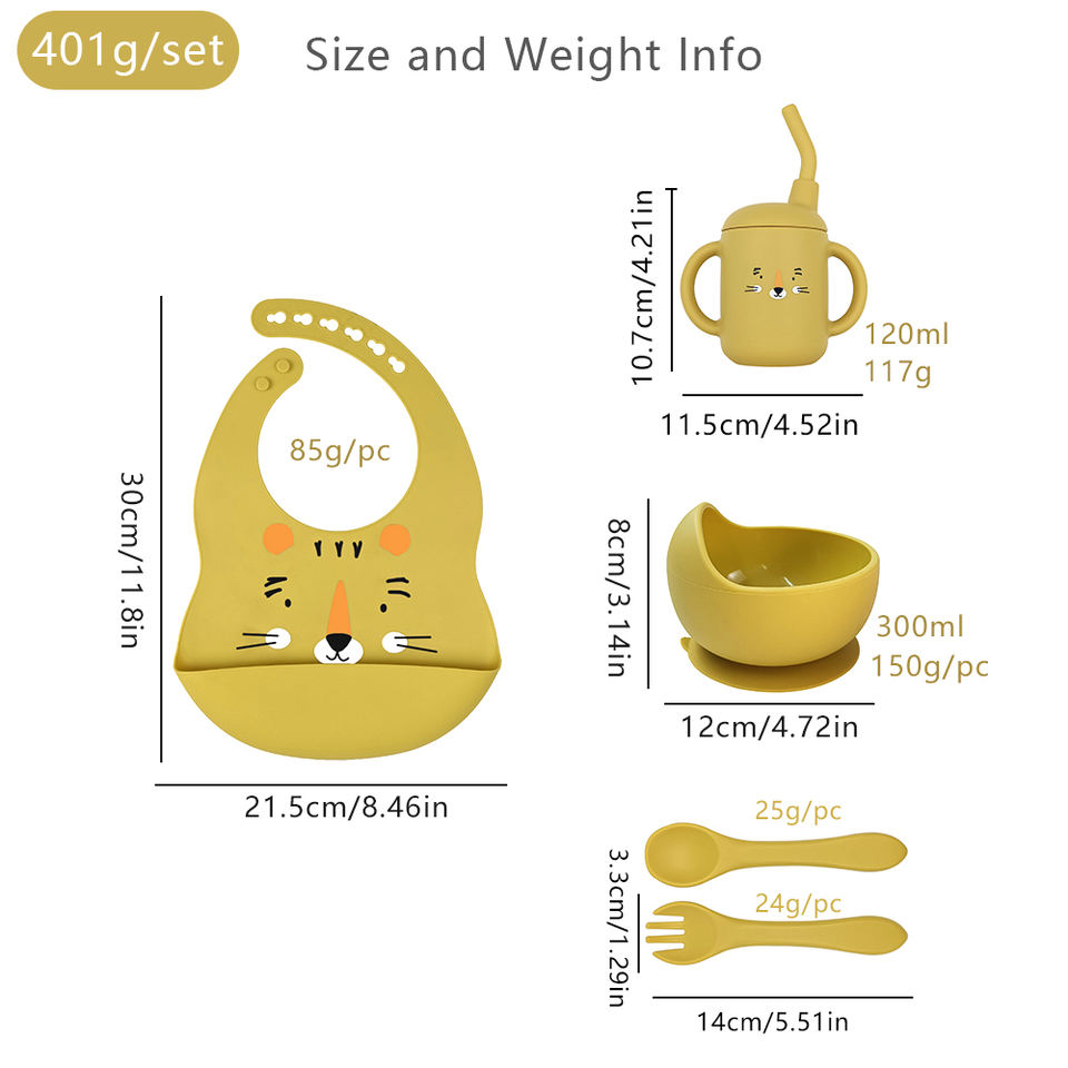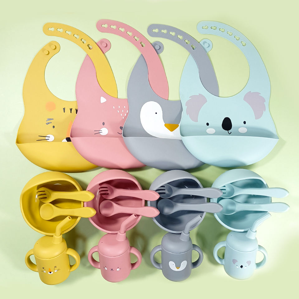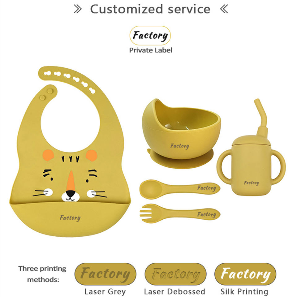 Set de Diversification Alimentaire en Silicone pour Bébé, Verre à Couvercle, Bavoirs Imprimés Design OEM, Couverts en Bambou avec Gobelet à Paille