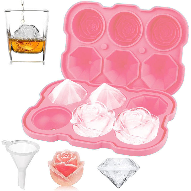 Moule à glace en silicone Formes amusantes avec couvercle transparent de type entonnoir 3 boules de glace diamantées 3 roses pour refroidir les boissons aux cocktails au whisky