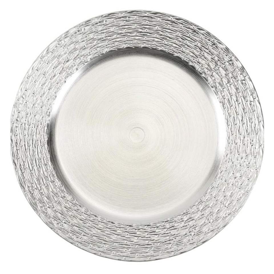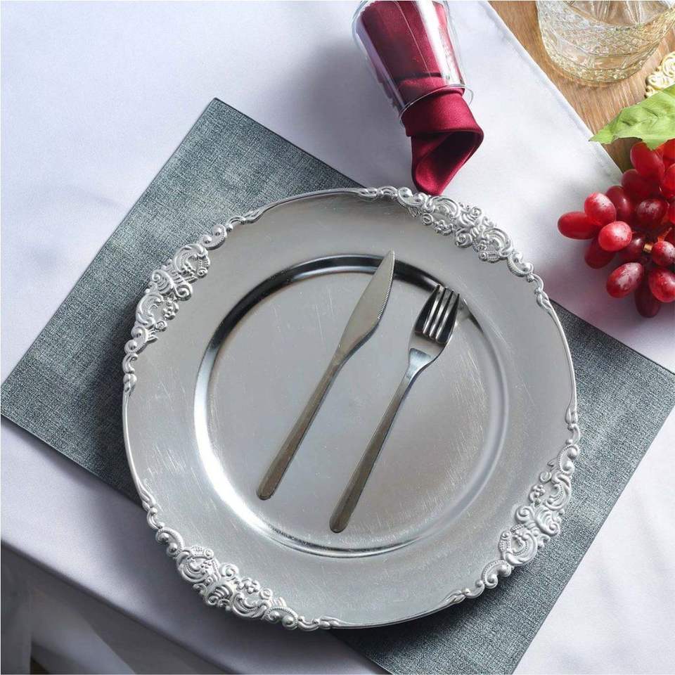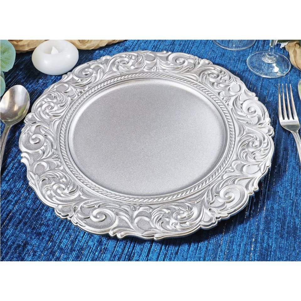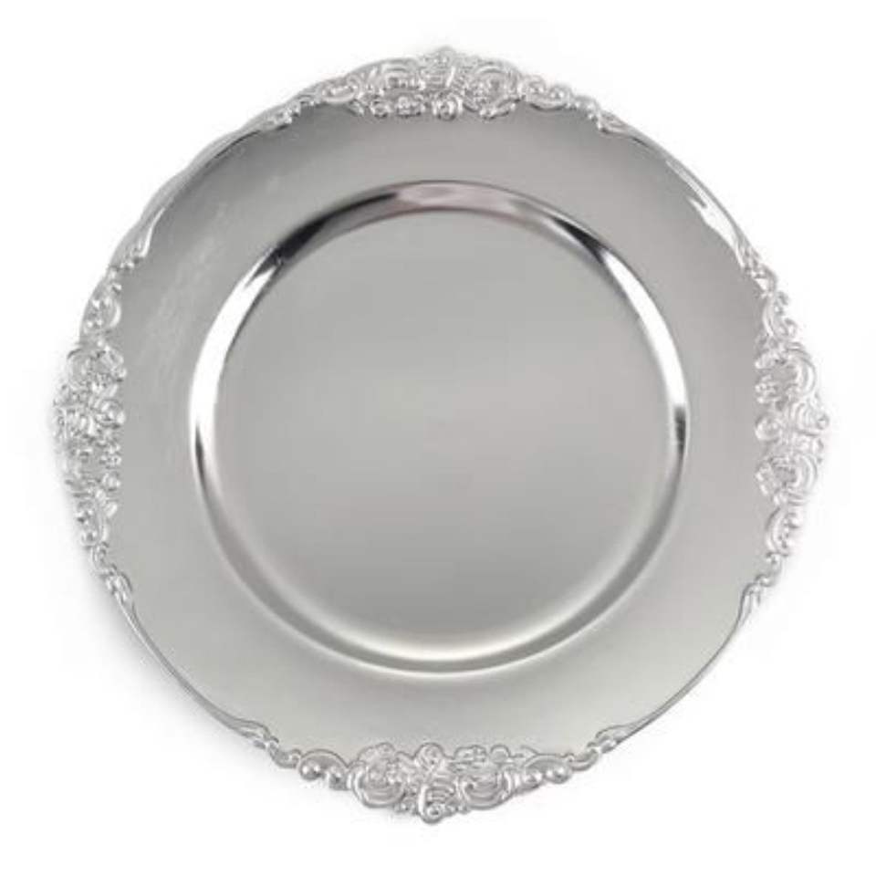 Assiette de présentation ronde en métal argenté de style baroque, de luxe, pour mariage, événement, fête, hôtel, vente en gros
