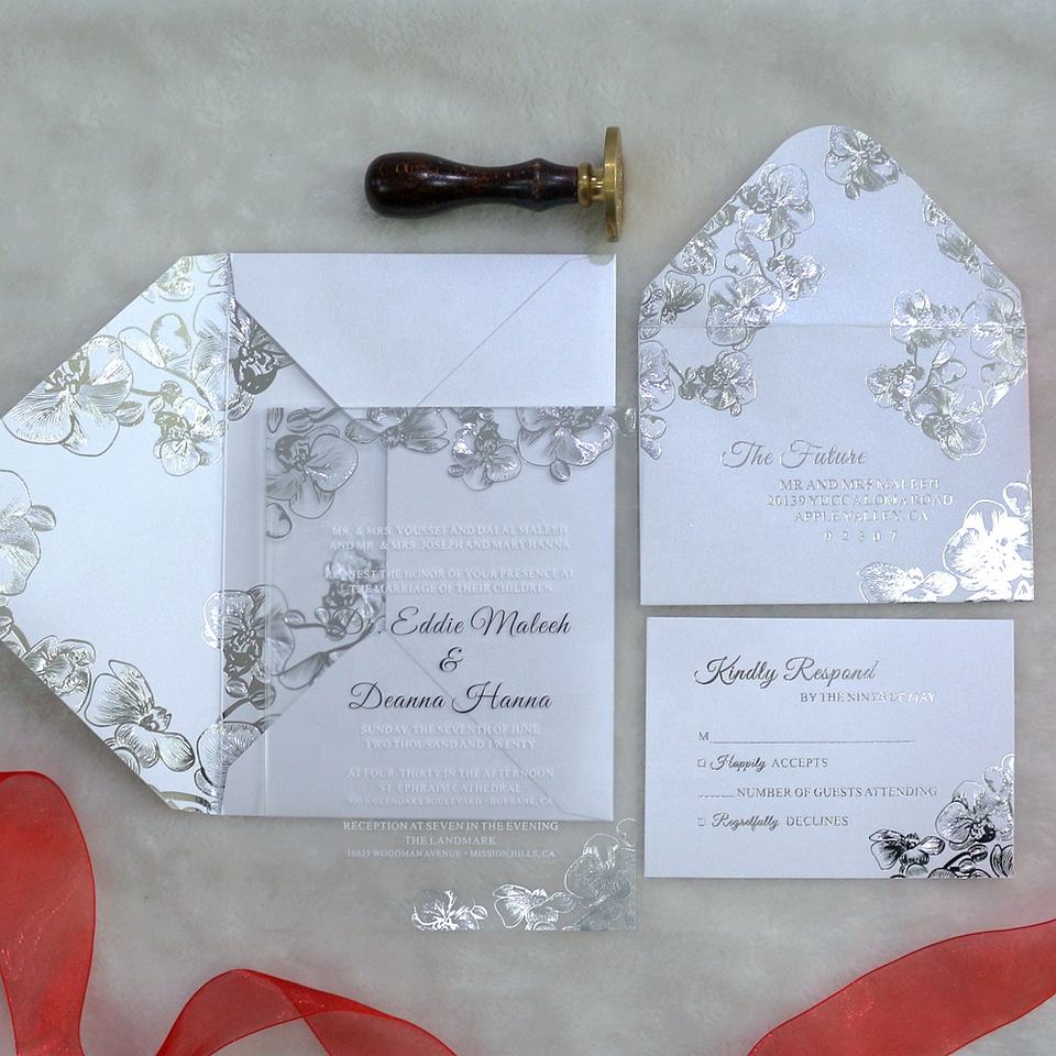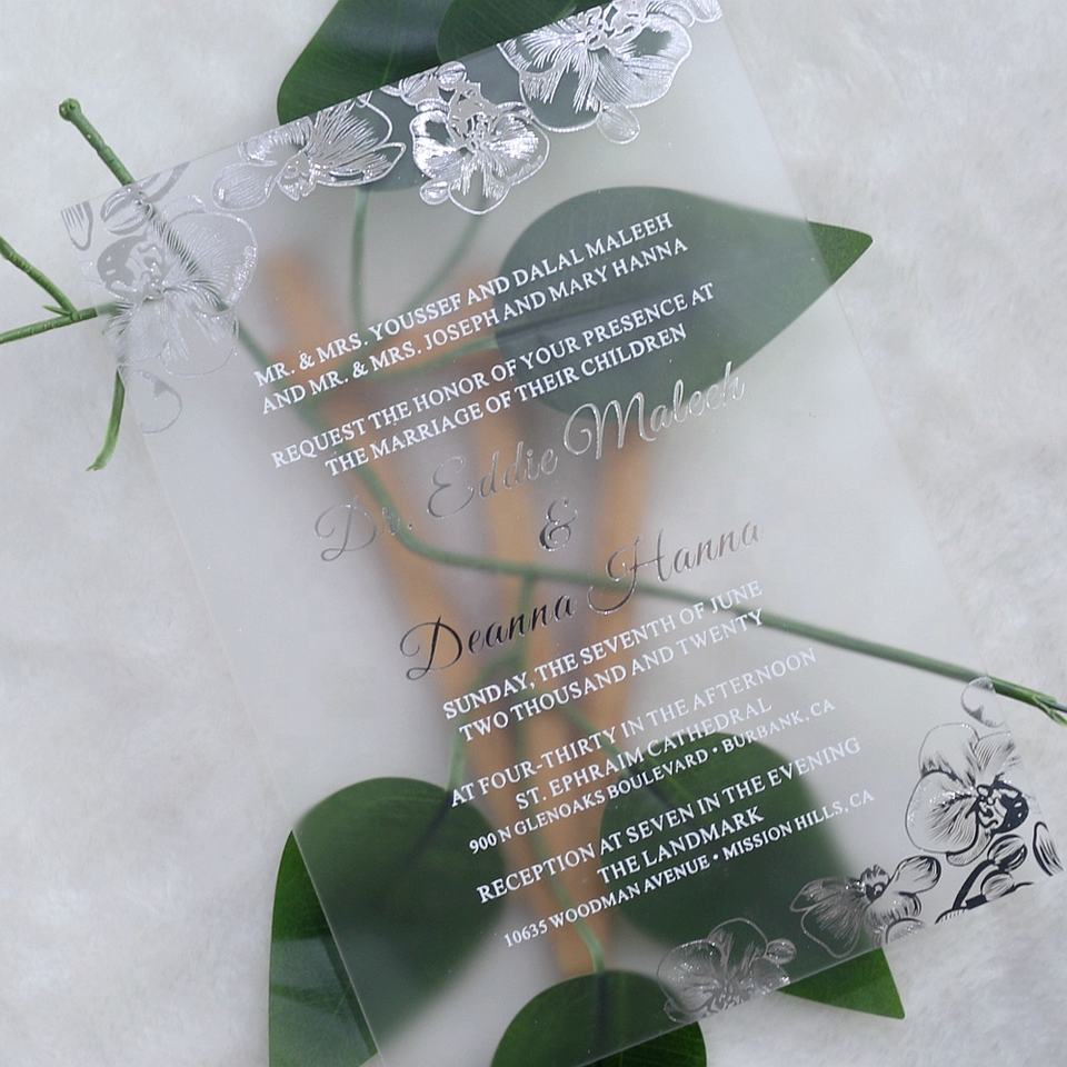 Carte d'invitation de mariage en acrylique givré, pièces, avec impression florale, couleur argent