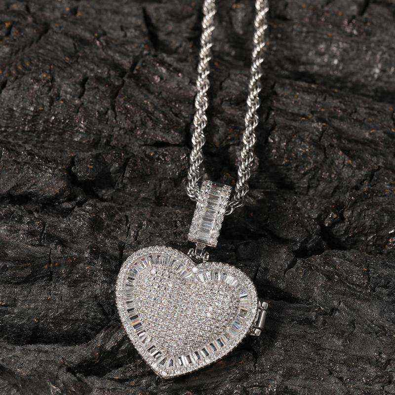 Collier Pendentif Cœur Ouvert en Zircon Cubique Baguette Couleur Argent avec Chaîne Tennis Givrée, Bijou Tendance pour Femme