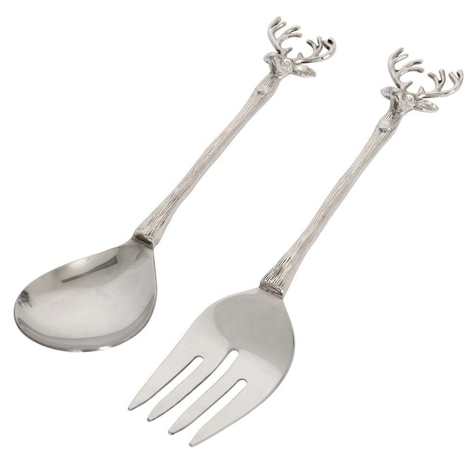 Cuillère à salade en forme de corne de cerf argentée, luxe royal, métal réutilisable, plaqué or, serveur à salade en acier inoxydable plaqué