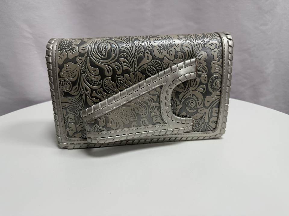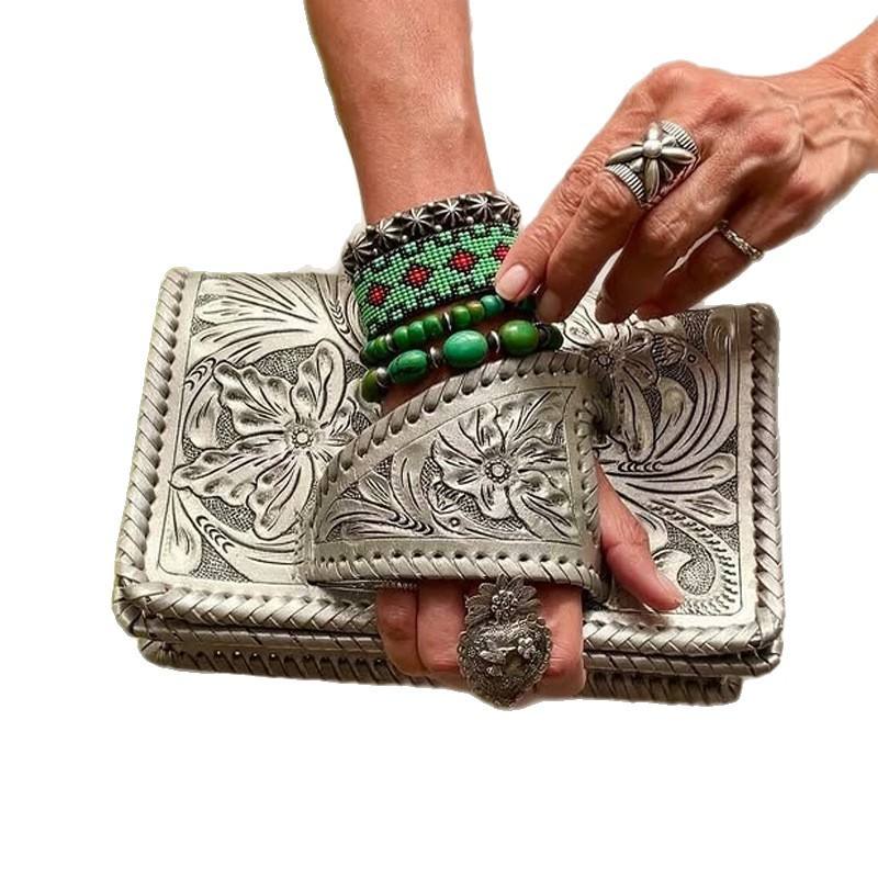 Sac à main de soirée style occidental en PU gaufré argenté, grande capacité, motif floral argenté, pochette européenne et américaine
