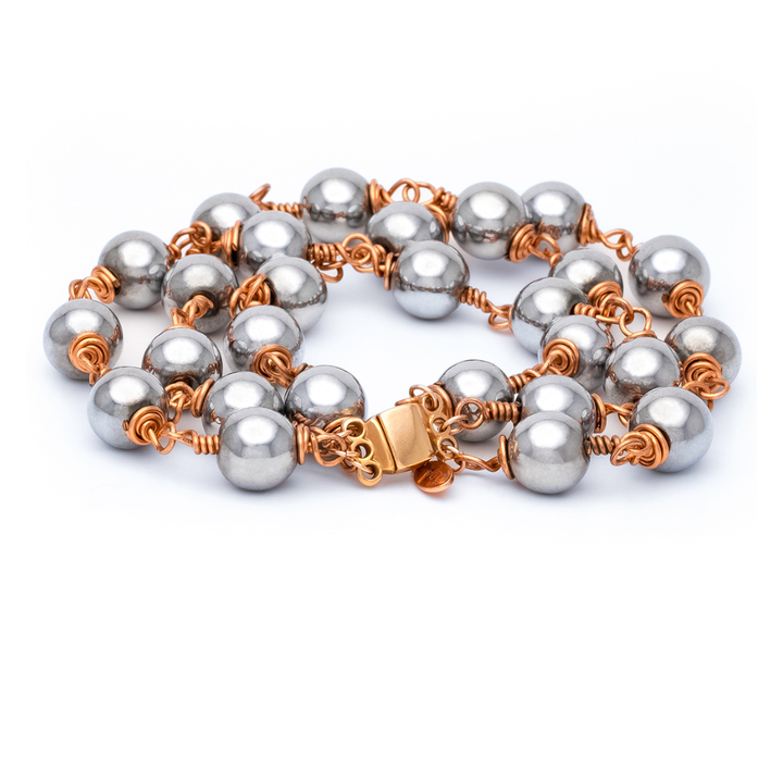 Perles d'hématite argentées magnifiquement enveloppées de fil d'or rose