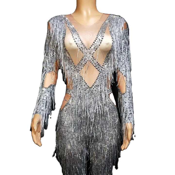 Argent manches longues strass franges barboteuses Sexy Club gland combishort danse Costume scène Performance porter femmes combinaison