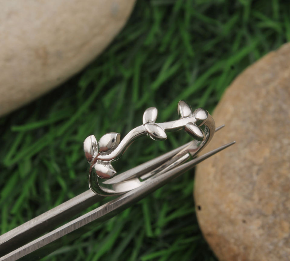 Bague ajustable plaquée argent avec serti clos, motif feuille et branche d'olivier, pour femme, bijou fin minimaliste, cadeau idéal pour fêtes et anniversaires