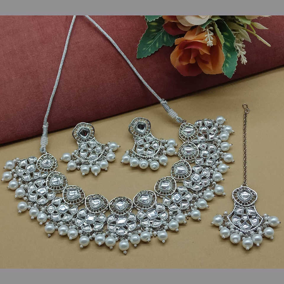 Silver Plated Kundan Stone and Beads Necklace Set 10581275WH Exquisite Fine Jewelry Set