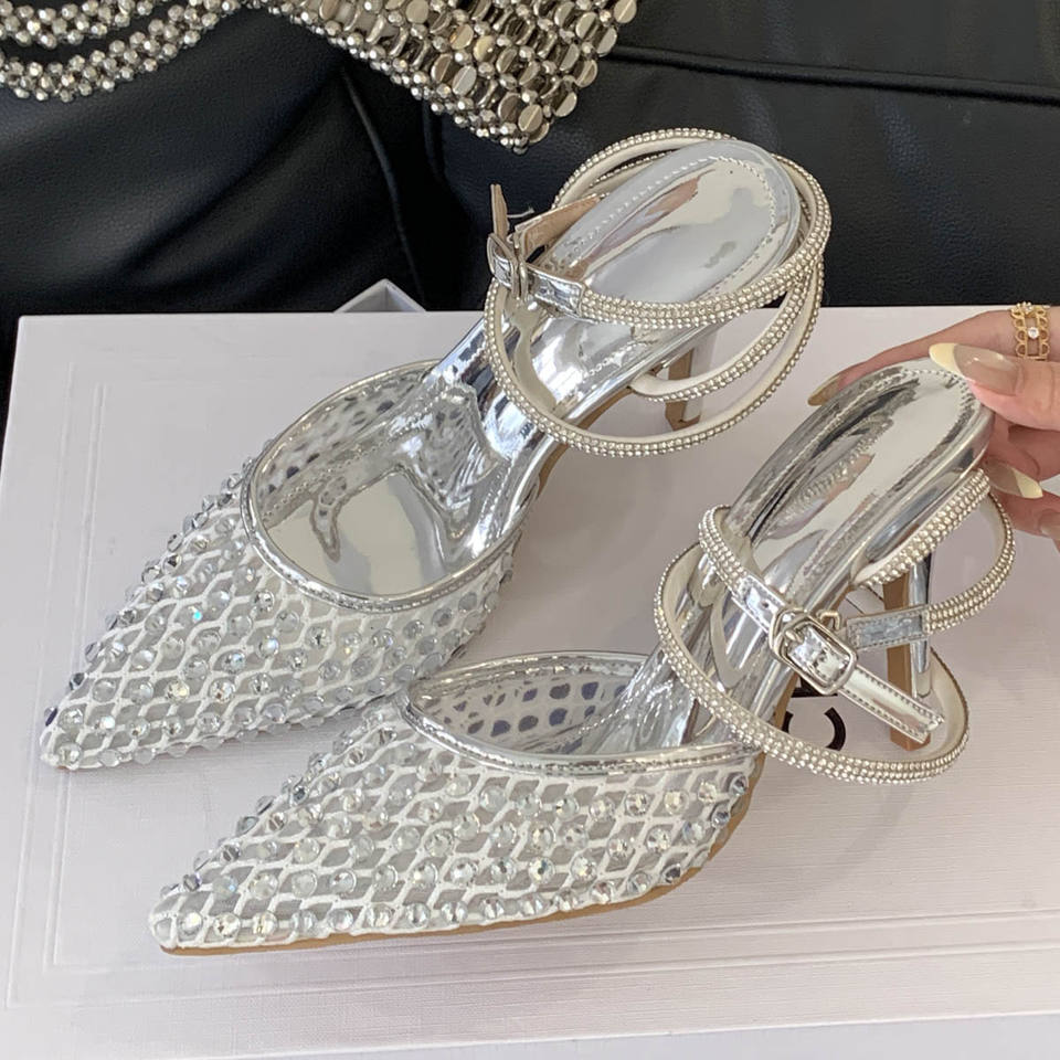 Chaussures de mariage à talon aiguille ultra-haut pour femme, avec boucle argentée pointue et dessus en cristal, style tendance et sexy