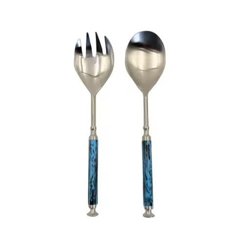 Ensemble de service à salade en argent poli, ustensiles de service à salade décoratifs en métal avec poignée ronde en résine bleue, ensemble de service à salade