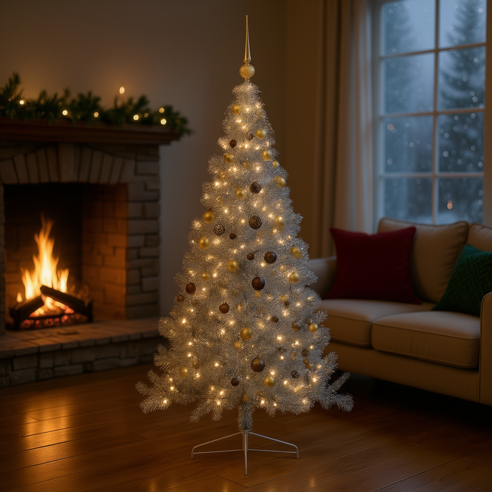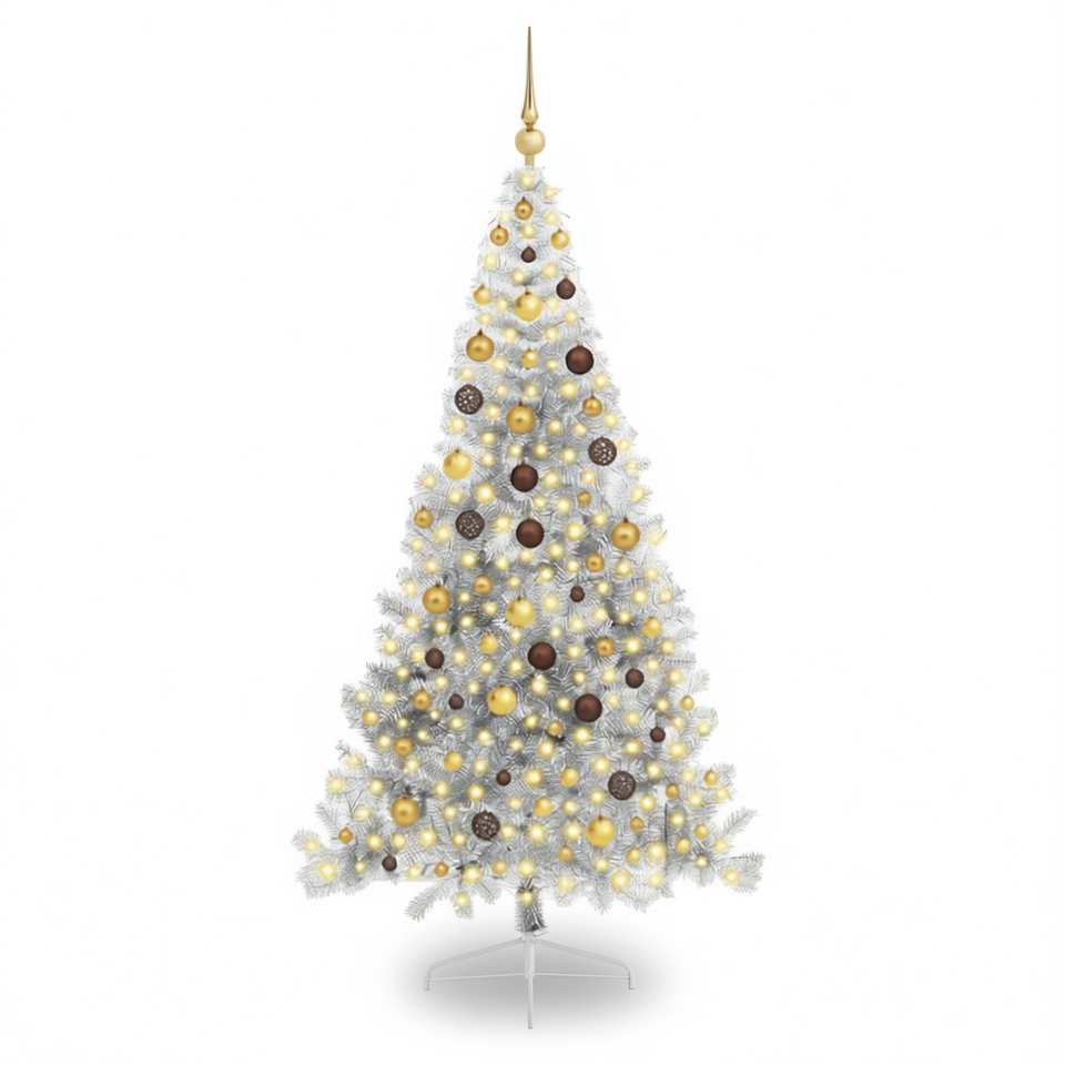 Sapin de Noël artificiel pré-éclairé argenté de 82,7 pouces en matériau PET, LED blanc chaud, base autoportante pour intérieur avec décorations et ornements