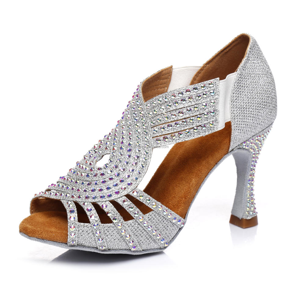 Sandales de danse en cuir pour femmes avec strass argentés, talons de 6 à 9 cm, pour la danse latine, le tango, la rumba, la salsa, la danse de salon, la valse, les mariages et les fêtes