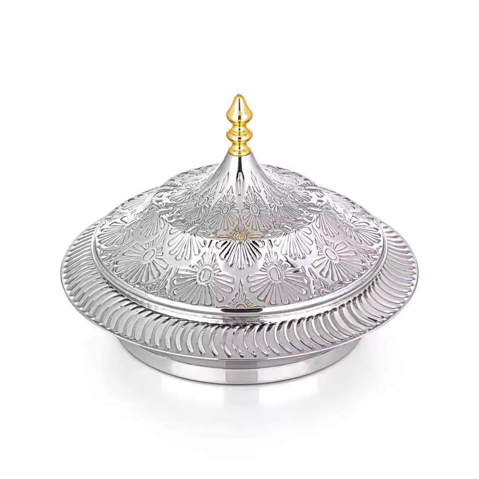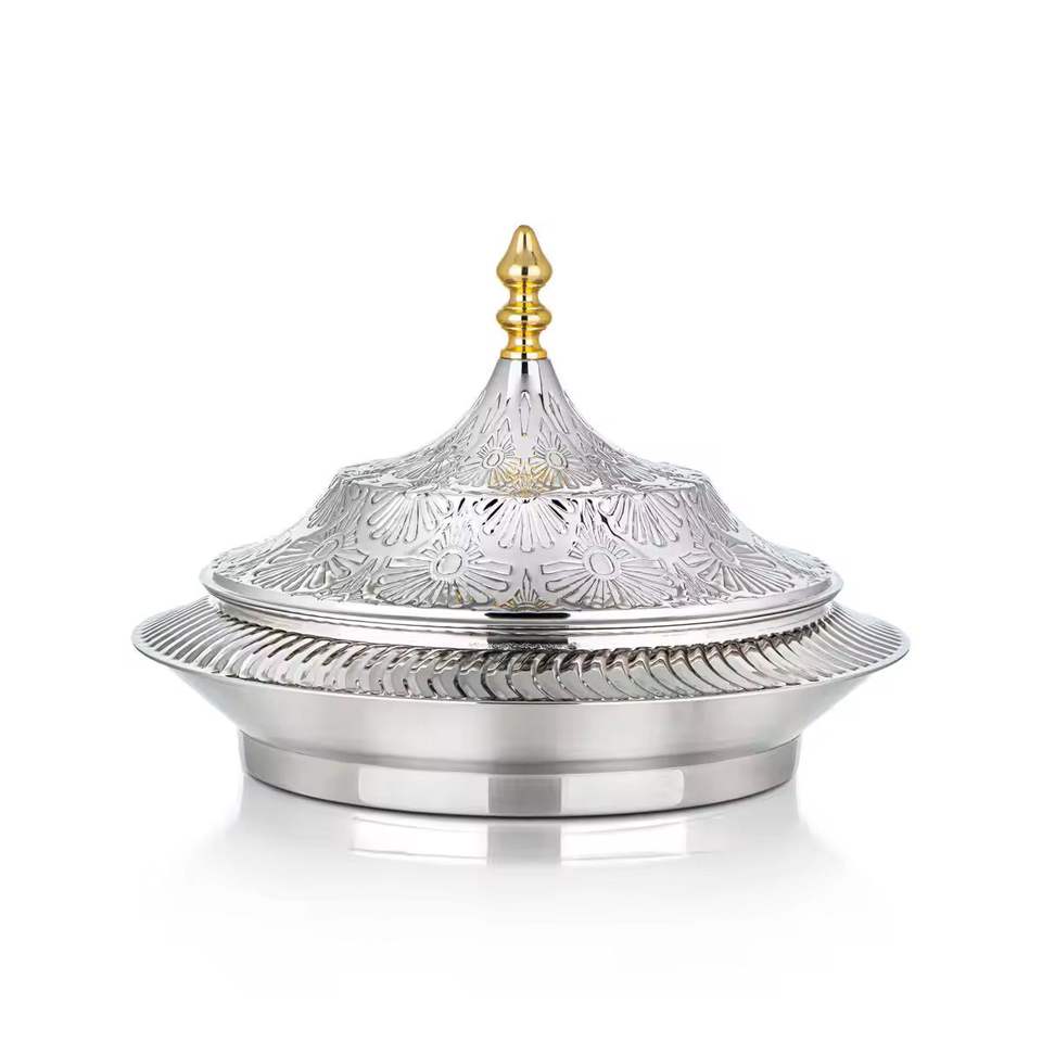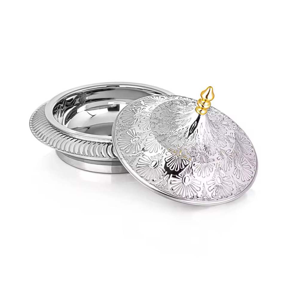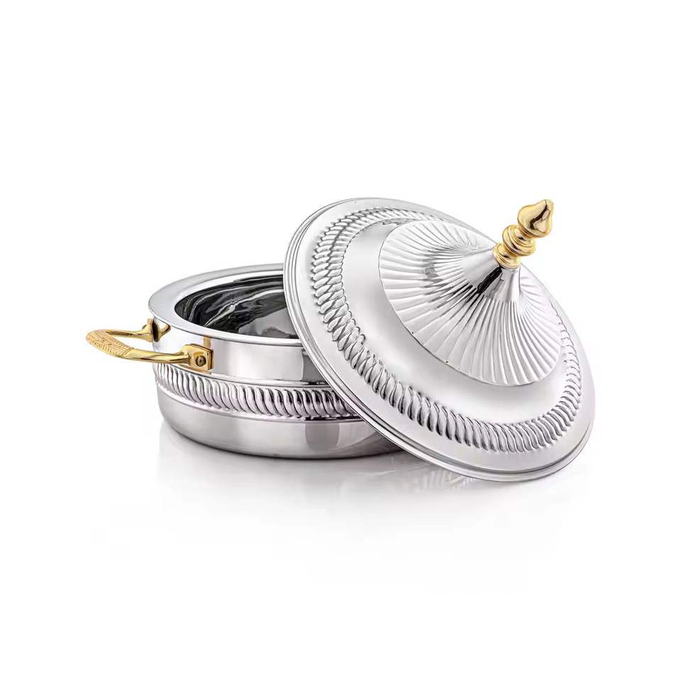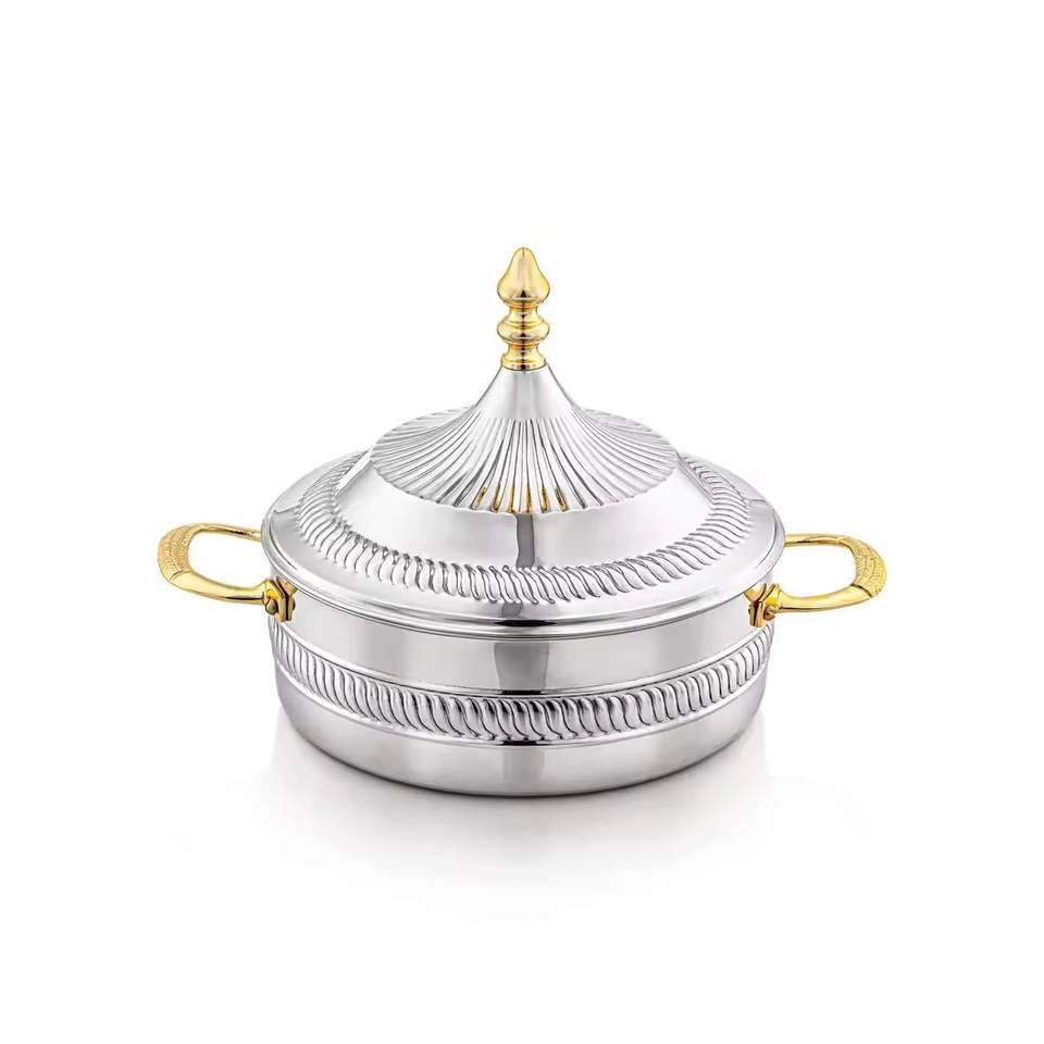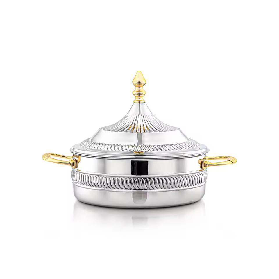 Marmite de luxe isolée avec design en corde argentée et accents dorés, chauffe-plats thermique, plat de service pour buffet de mariage, pot haut de gamme