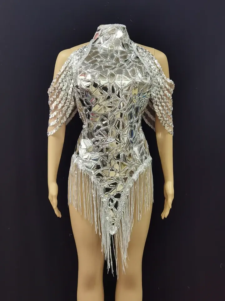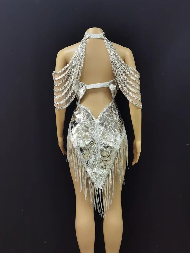 Argent paillettes Bling strass justaucorps Sexy danse body Costume anniversaire chanteur scène porter Performance salle de bal porter